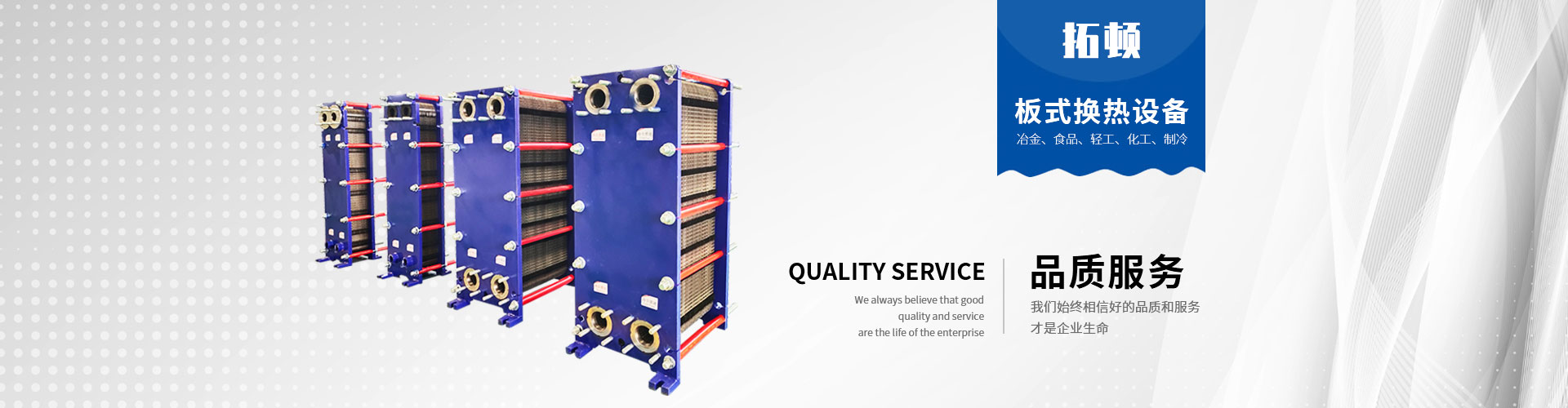 經(jīng)過持續(xù)努力,拓頓取得了質(zhì)量、健康和環(huán)境體系的“三標(biāo)一體”認(rèn)證、美國ASME 認(rèn)證。制造許可證等體系認(rèn)證; 公司以8大族群30余種換熱產(chǎn)品為載體, 為化工、冶金、供熱、機(jī)械油冷、醫(yī)藥、造紙、輕紡、船舶、石油、電力、集中供暖、空調(diào)制冷、食品飲料、海水淡化、海水養(yǎng)殖,生物質(zhì)能分布式能源等行業(yè)提供個性化、專業(yè)化的解決方案用于加熱、冷卻、蒸發(fā)、冷凝、殺菌毒、余熱回收等。